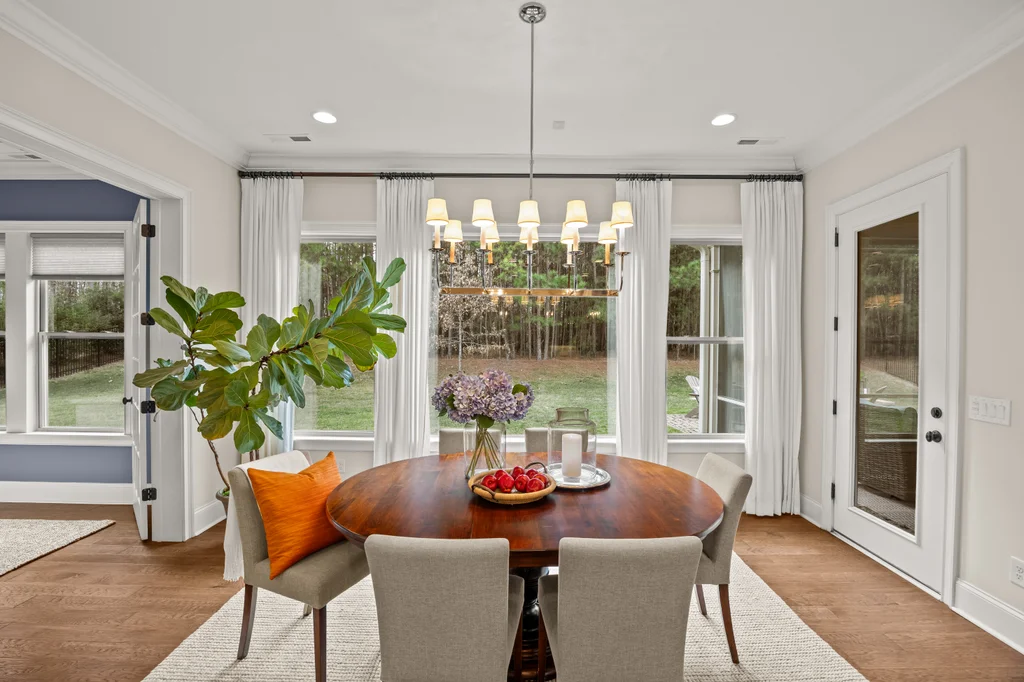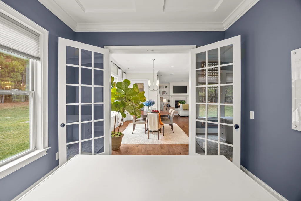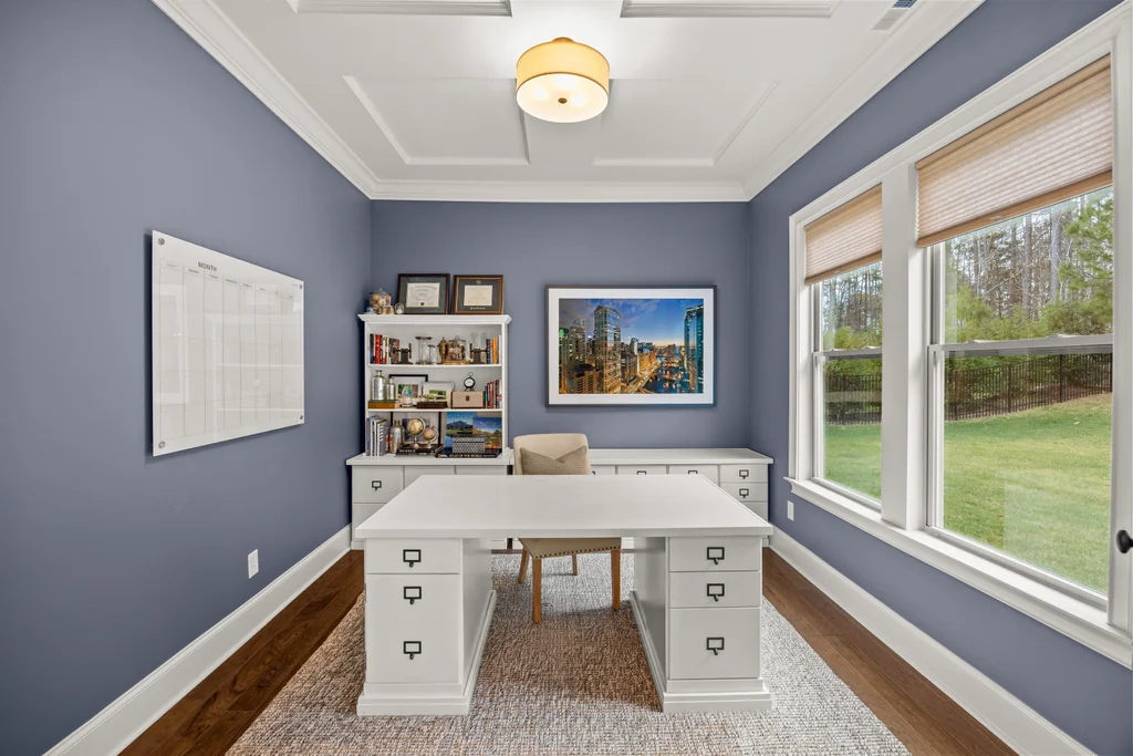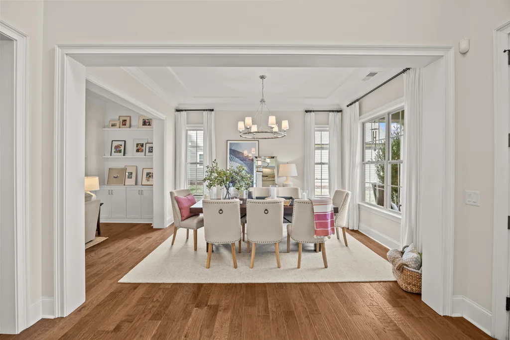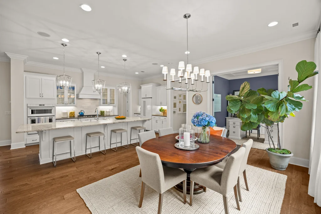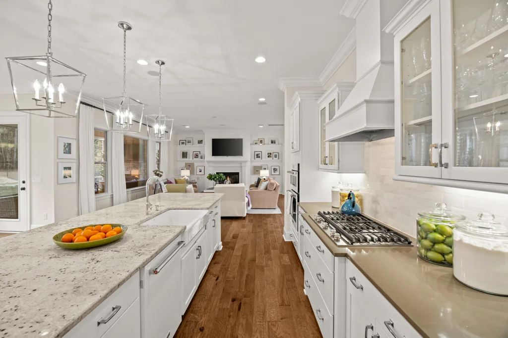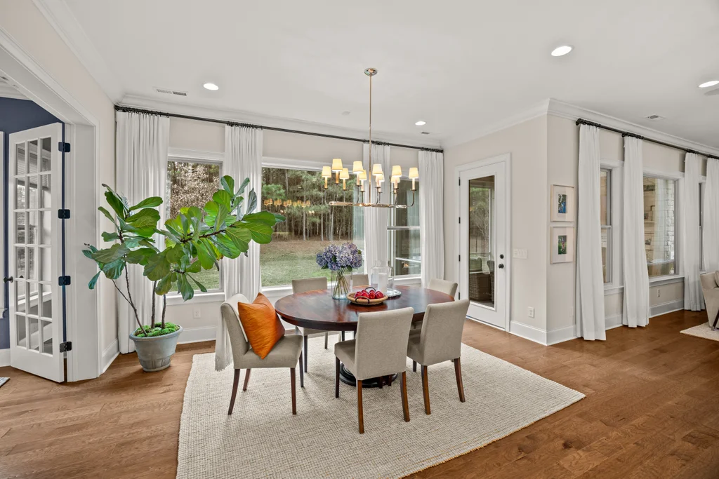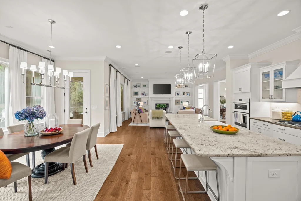 Upon entry, natural light, soaring ceilings, and wide-plank hardwood floors create an immediate sense of openness. The dining room with ceiling detail and expansive windows flows seamlessly into the inviting great room featuring custom built-ins and a gas fireplace — spacious enough for entertaining, yet warm for everyday living. The chef’s kitchen anchors the home with white cabinetry, exceptional storage, quartz perimeter countertops, a contrasting granite island with generous seating, stainless gas cooktop, KitchenAid convection oven and microwave, and walk-in pantry. The adjacent breakfast area overlooks the serene backyard and wooded backdrop. A main-level office with French doors provides privacy for work or study.