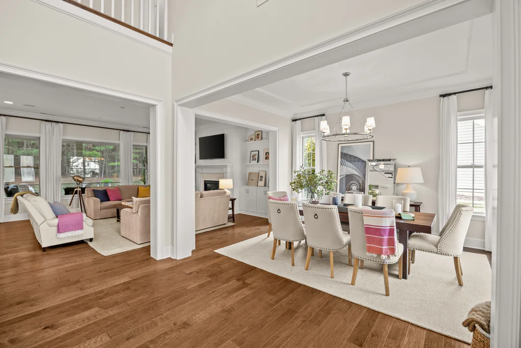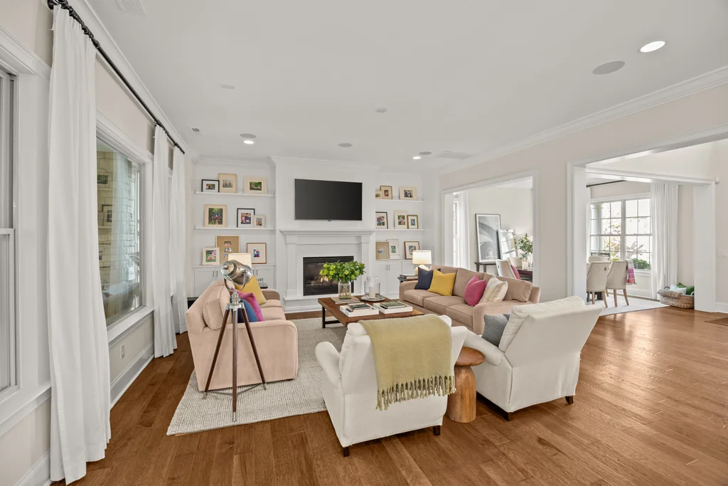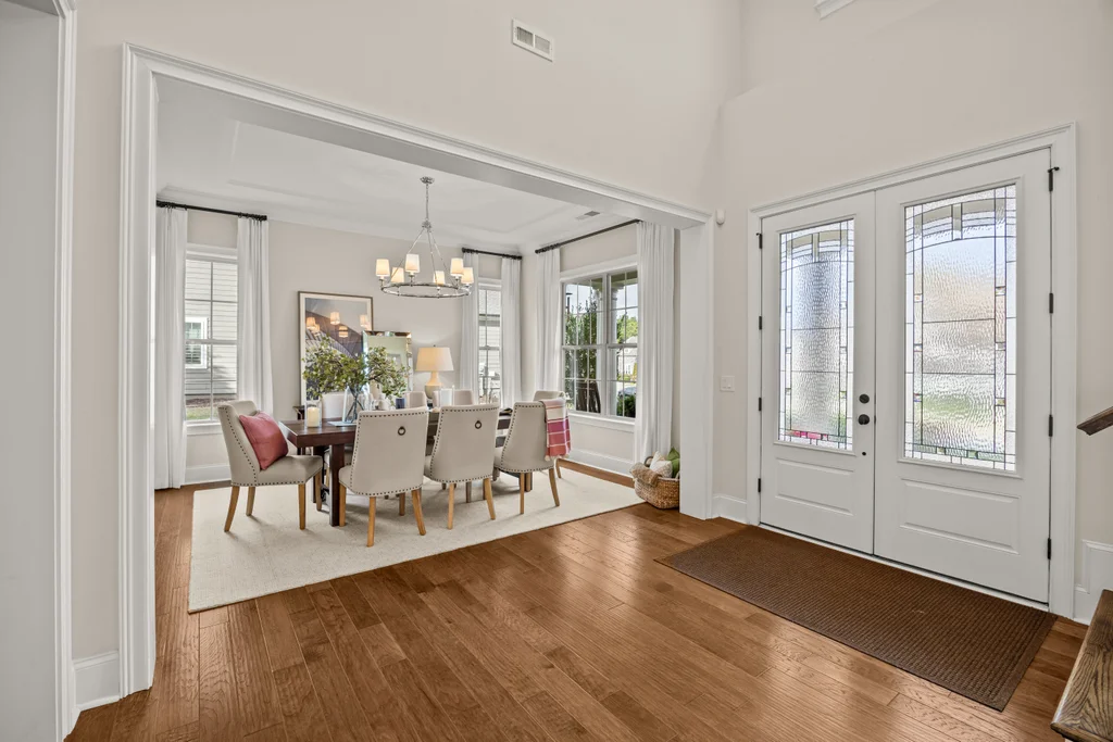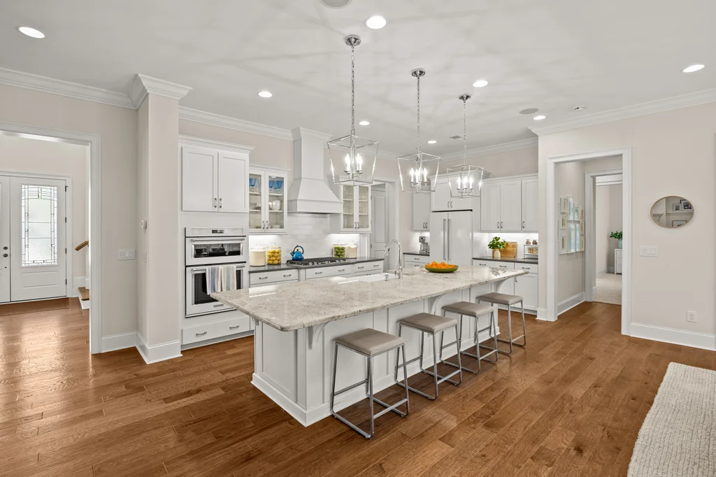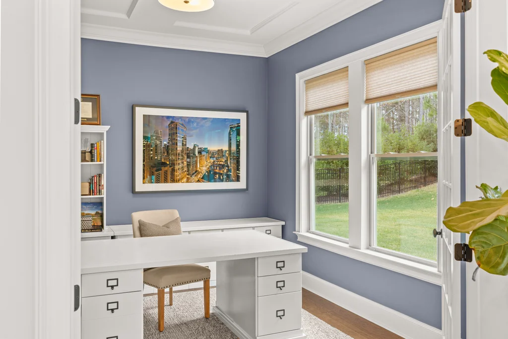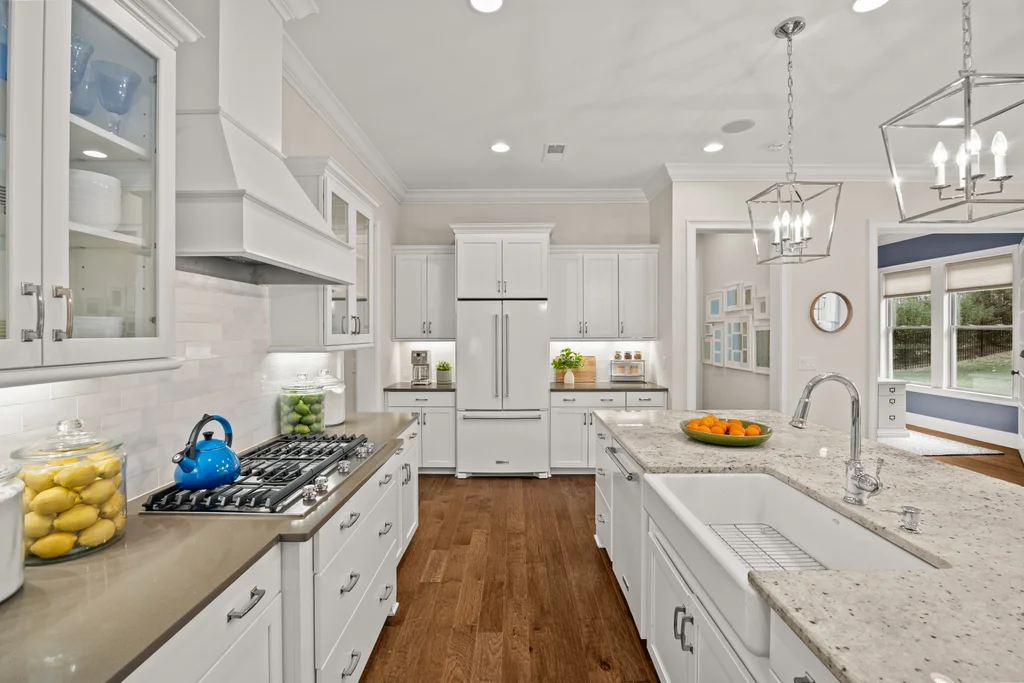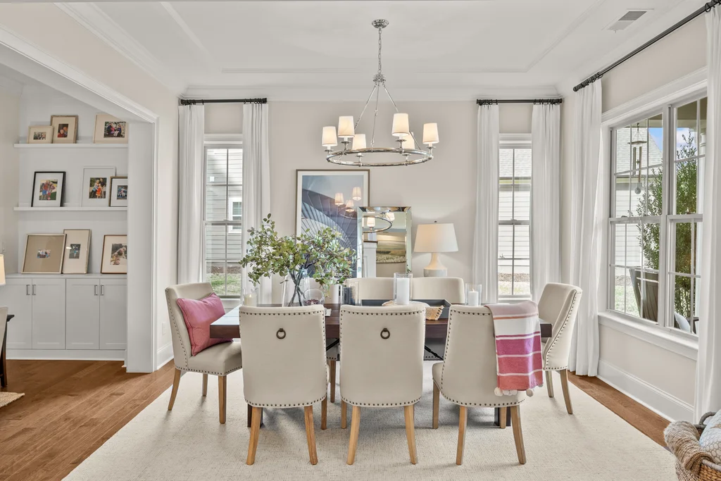 Upon entry, natural light, soaring ceilings, and wide-plank hardwood floors create an immediate sense of openness. The dining room with ceiling detail and expansive windows flows seamlessly into the inviting great room featuring custom built-ins and a gas fireplace — spacious enough for entertaining, yet warm for everyday living. The chef’s kitchen anchors the home with white cabinetry, exceptional storage, quartz perimeter countertops, a contrasting granite island with generous seating, stainless gas cooktop, KitchenAid convection oven and microwave, and walk-in pantry. The adjacent breakfast area overlooks the serene backyard and wooded backdrop. A main-level office with French doors provides privacy for work or study.