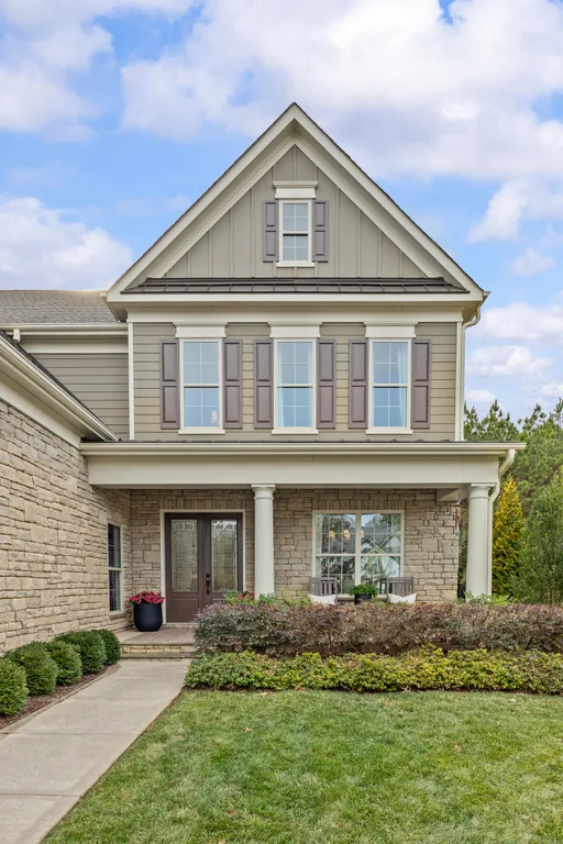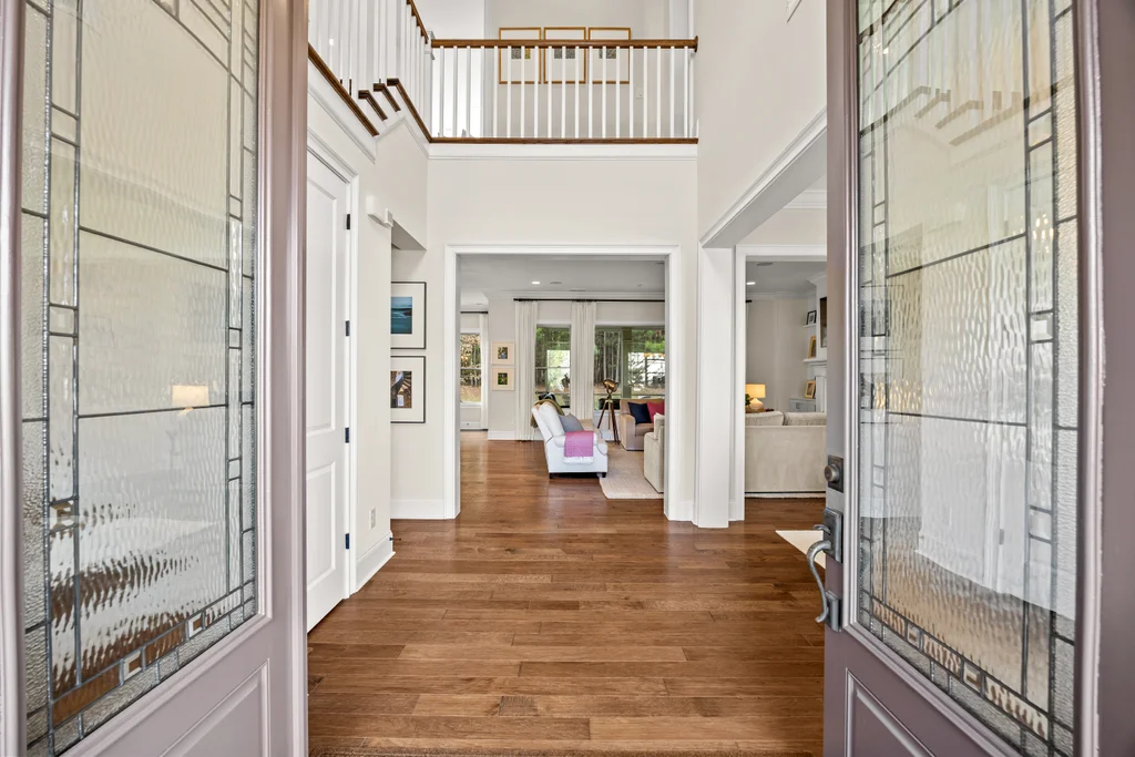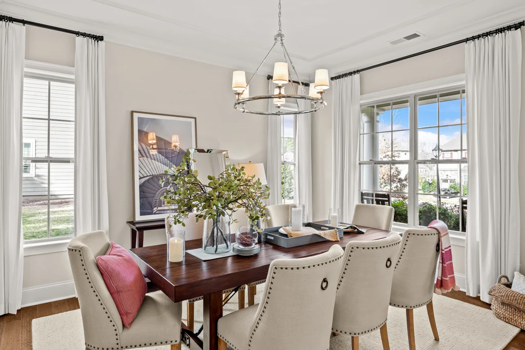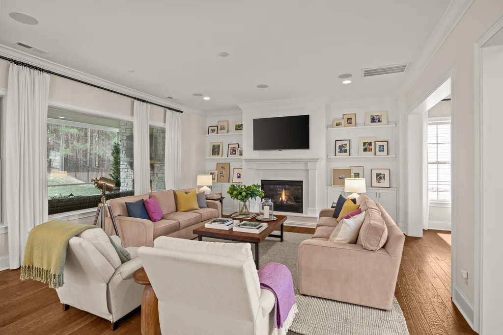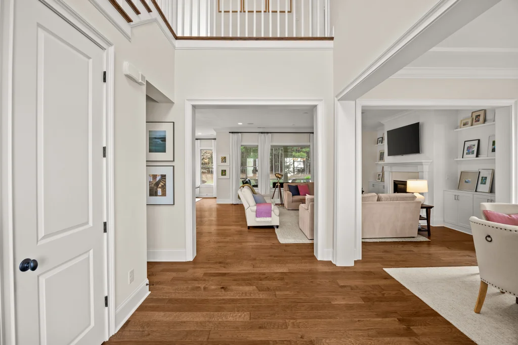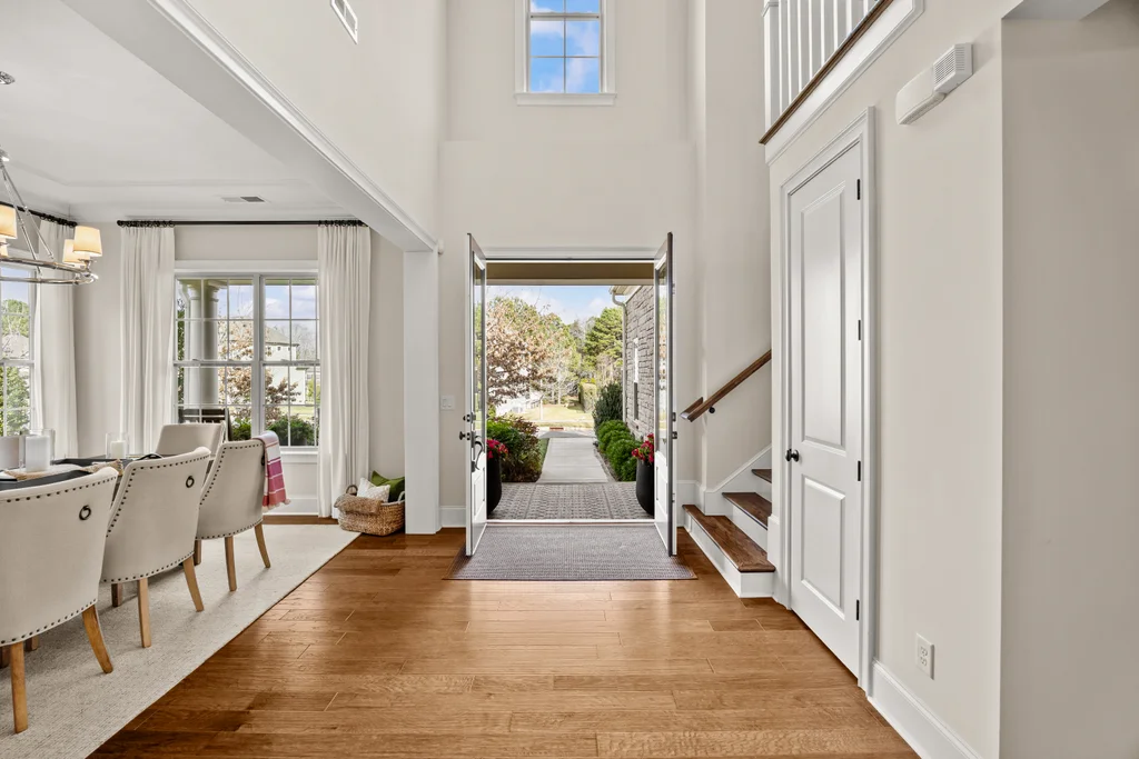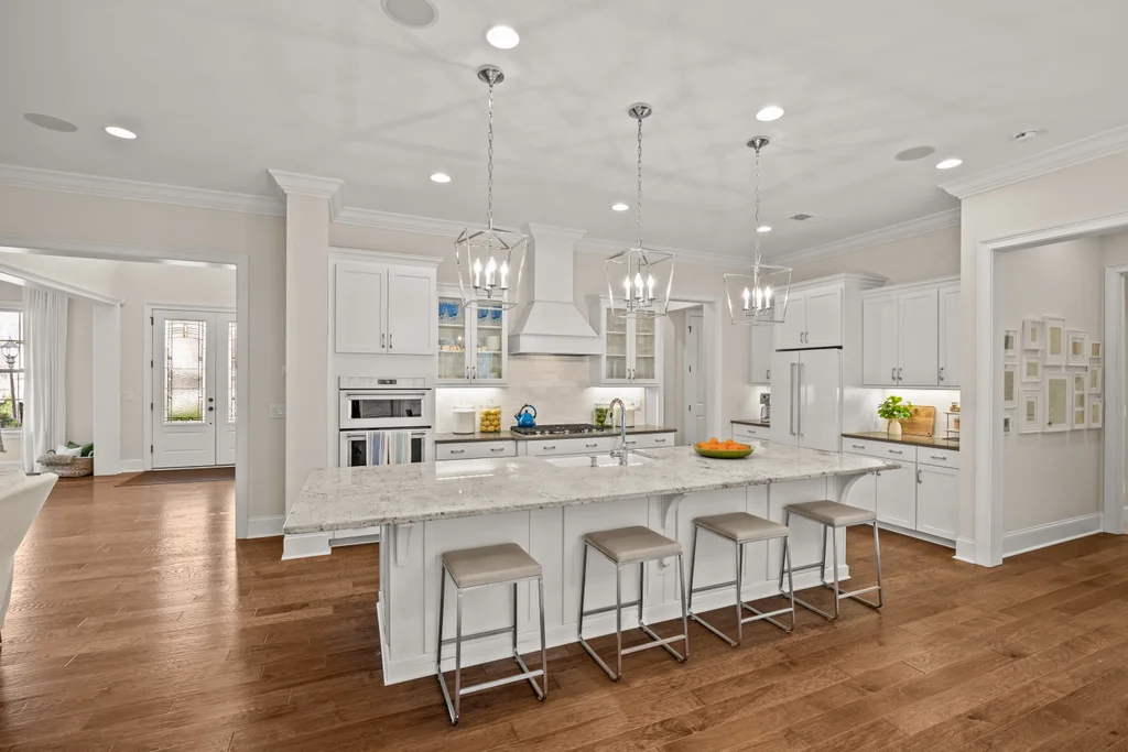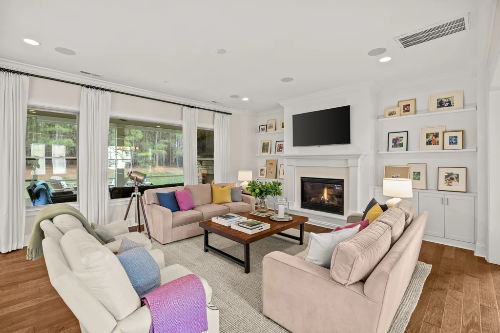 Upon entry, natural light, soaring ceilings, and wide-plank hardwood floors create an immediate sense of openness. The dining room with ceiling detail and expansive windows flows seamlessly into the inviting great room featuring custom built-ins and a gas fireplace — spacious enough for entertaining, yet warm for everyday living. The chef’s kitchen anchors the home with white cabinetry, exceptional storage, quartz perimeter countertops, a contrasting granite island with generous seating, stainless gas cooktop, KitchenAid convection oven and microwave, and walk-in pantry. The adjacent breakfast area overlooks the serene backyard and wooded backdrop. A main-level office with French doors provides privacy for work or study.