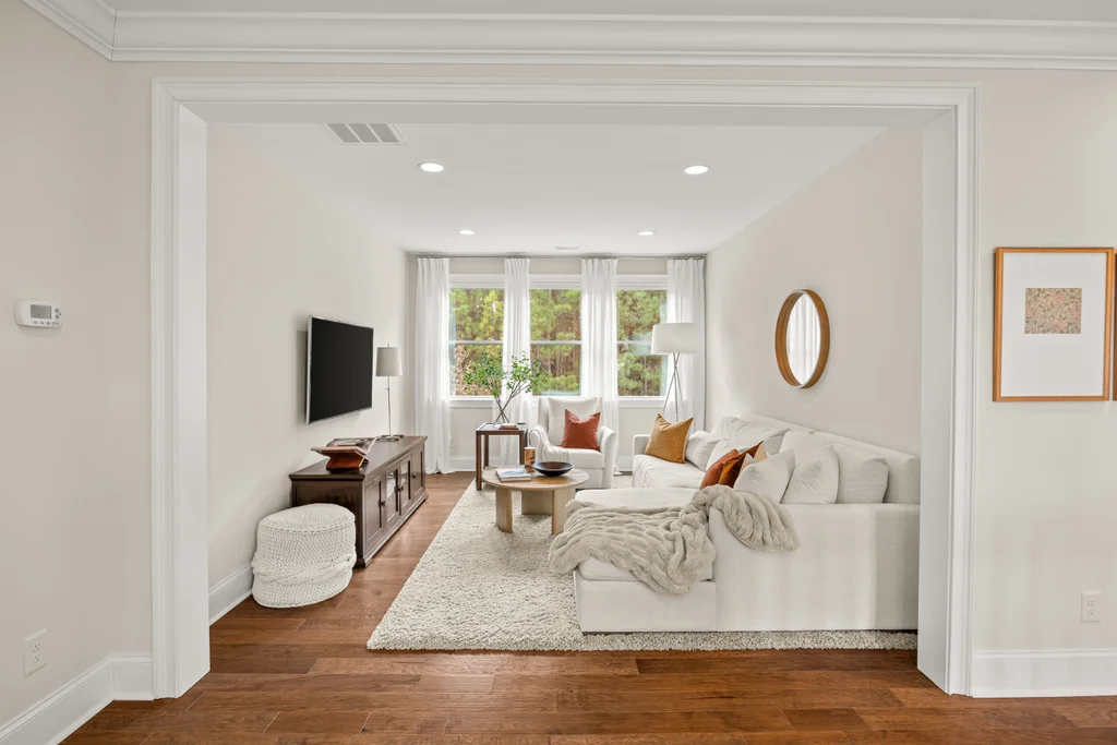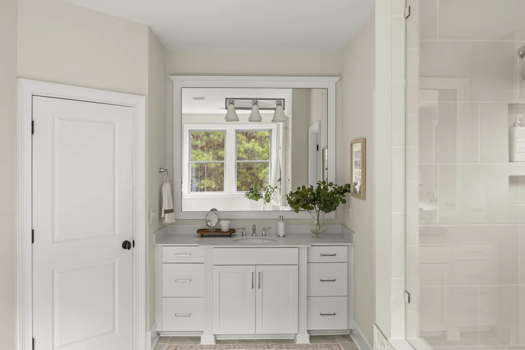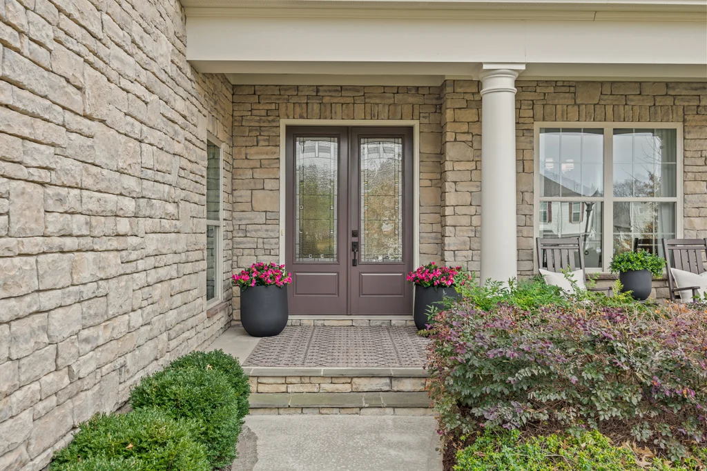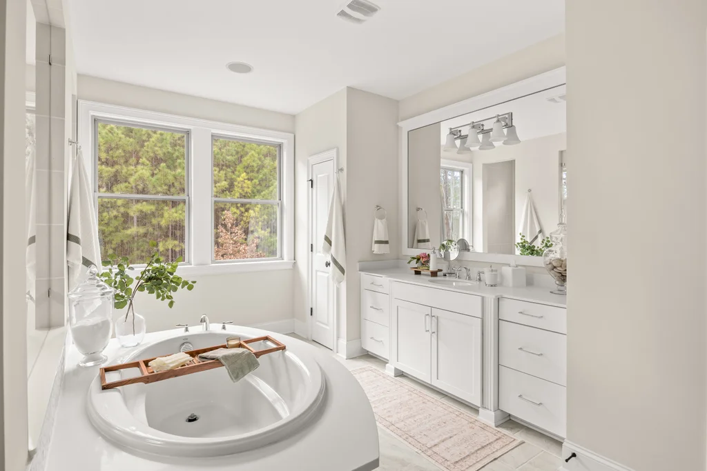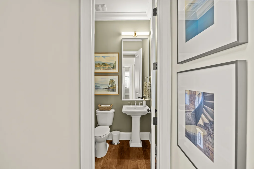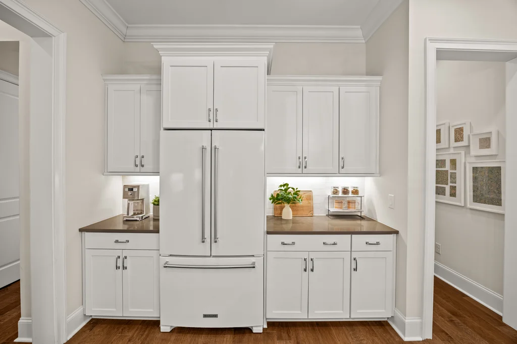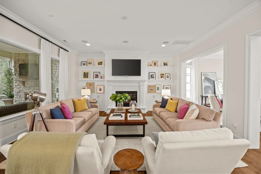 Upon entry, natural light, soaring ceilings, and wide-plank hardwood floors create an immediate sense of openness. The dining room with ceiling detail and expansive windows flows seamlessly into the inviting great room featuring custom built-ins and a gas fireplace — spacious enough for entertaining, yet warm for everyday living. The chef’s kitchen anchors the home with white cabinetry, exceptional storage, quartz perimeter countertops, a contrasting granite island with generous seating, stainless gas cooktop, KitchenAid convection oven and microwave, and walk-in pantry. The adjacent breakfast area overlooks the serene backyard and wooded backdrop. A main-level office with French doors provides privacy for work or study.