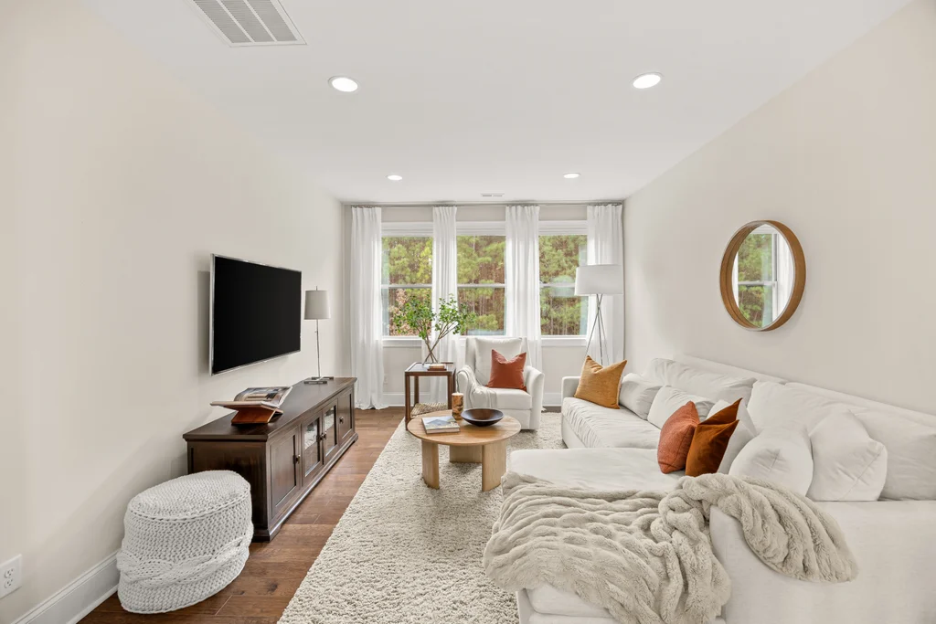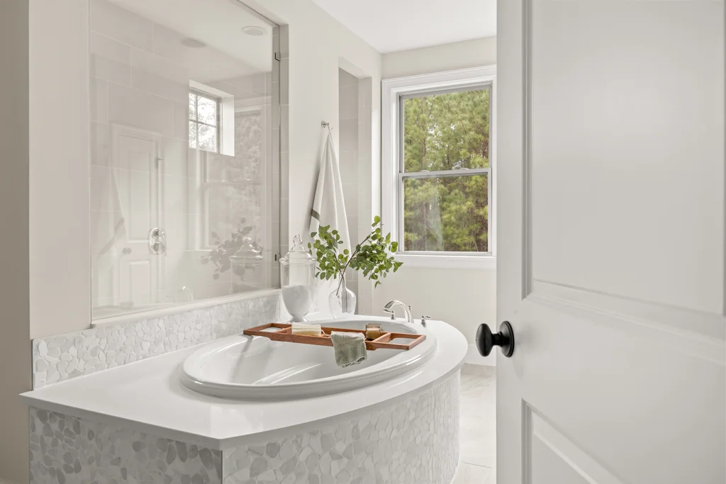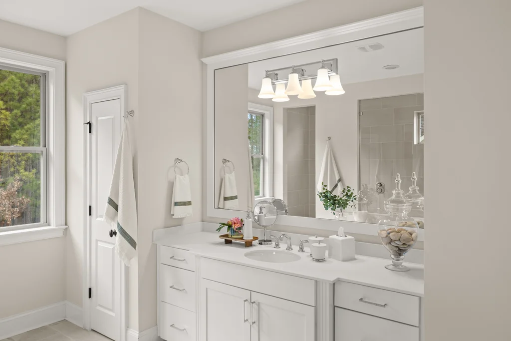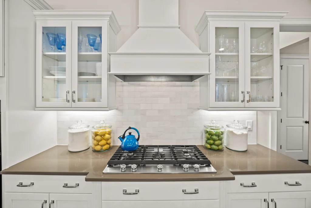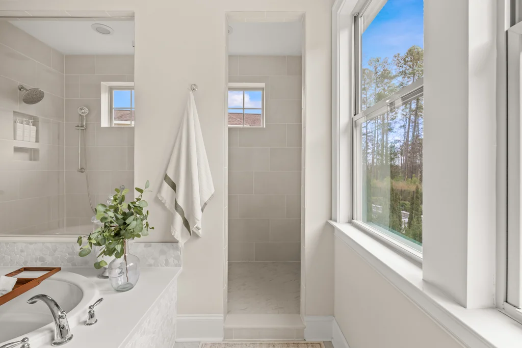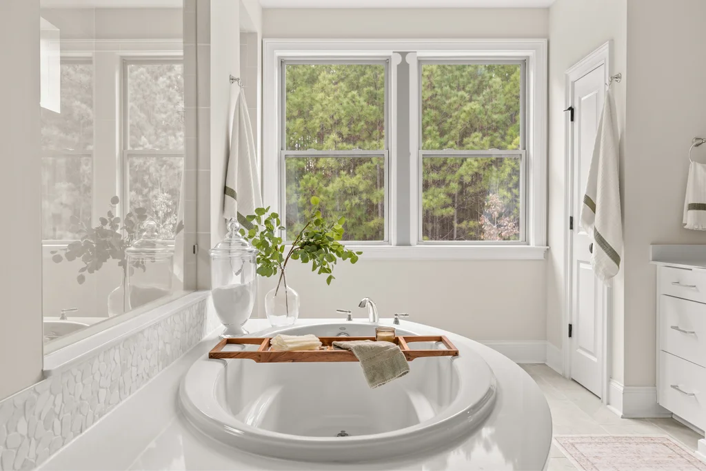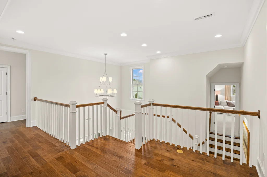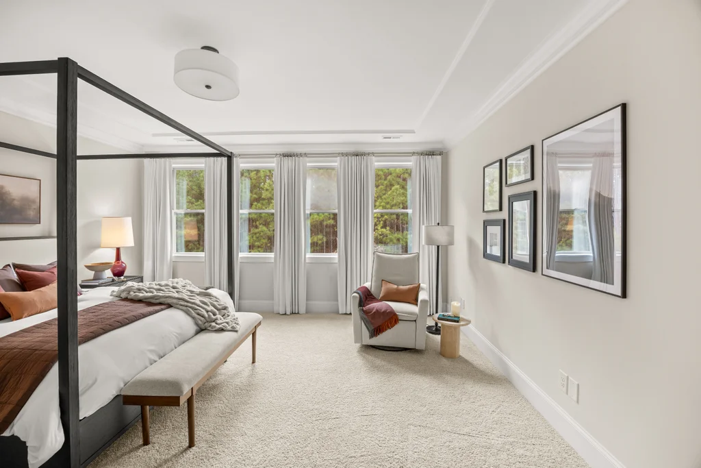 Upon entry, natural light, soaring ceilings, and wide-plank hardwood floors create an immediate sense of openness. The dining room with ceiling detail and expansive windows flows seamlessly into the inviting great room featuring custom built-ins and a gas fireplace — spacious enough for entertaining, yet warm for everyday living. The chef’s kitchen anchors the home with white cabinetry, exceptional storage, quartz perimeter countertops, a contrasting granite island with generous seating, stainless gas cooktop, KitchenAid convection oven and microwave, and walk-in pantry. The adjacent breakfast area overlooks the serene backyard and wooded backdrop. A main-level office with French doors provides privacy for work or study.