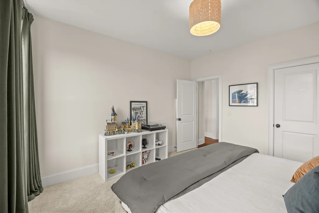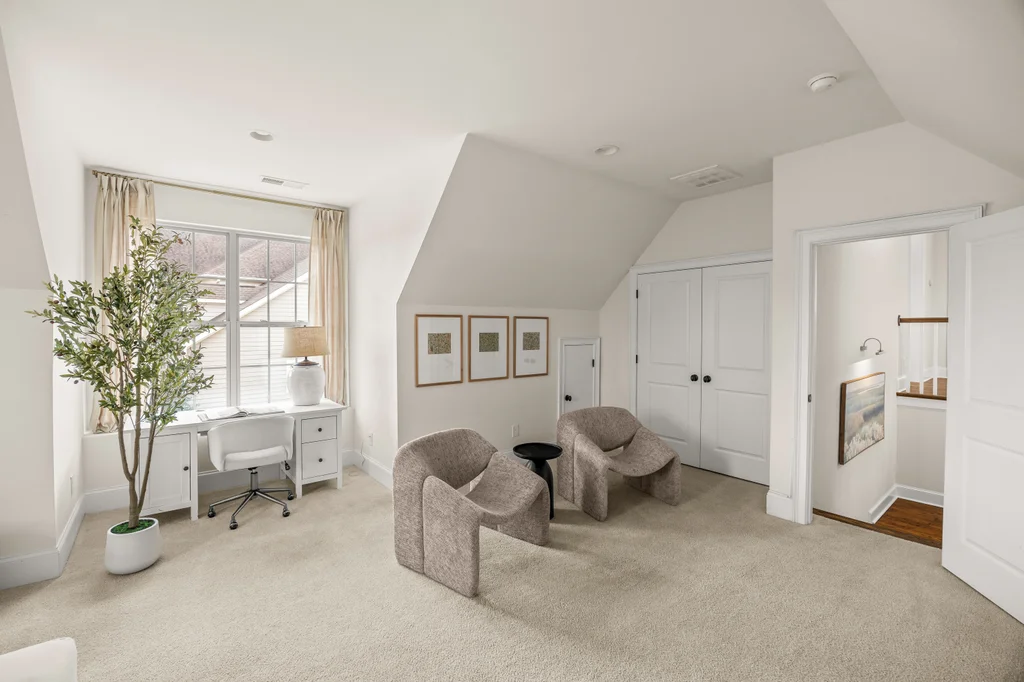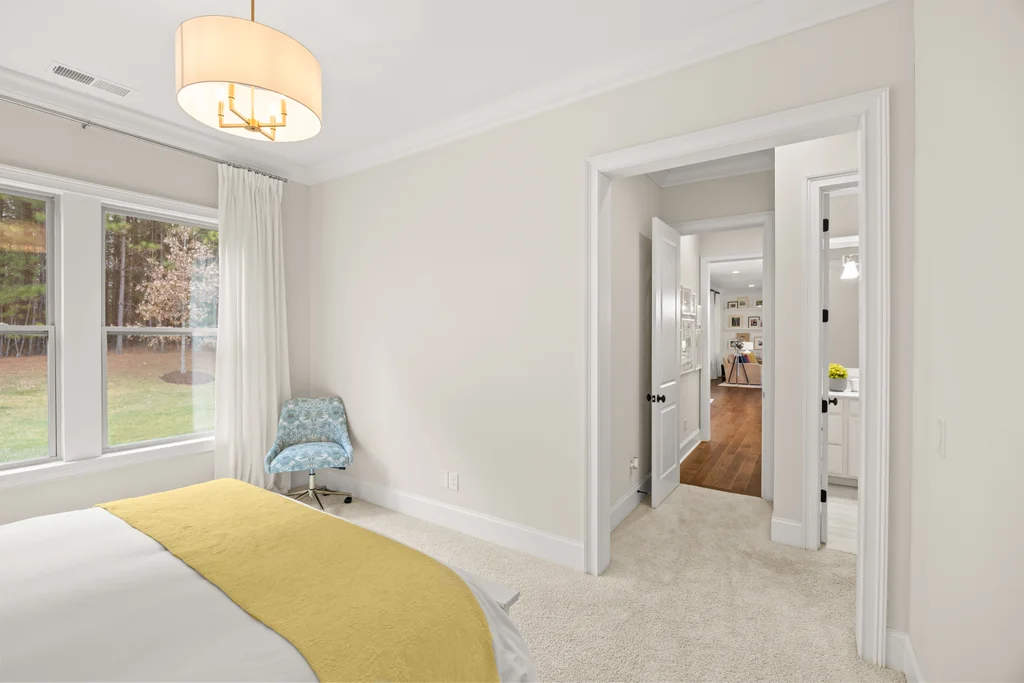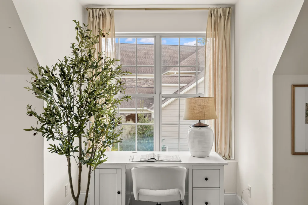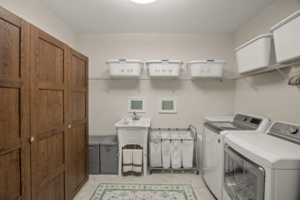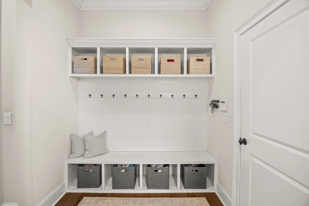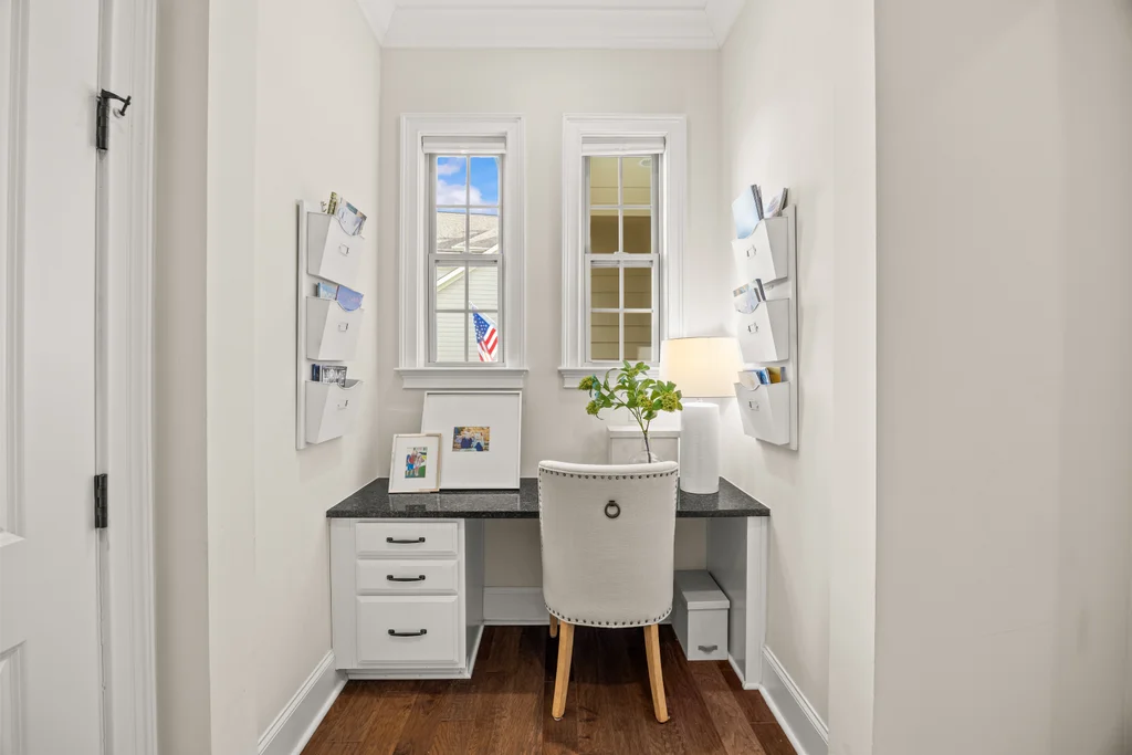 Tucked off the rear hallway, a private guest suite offers flexibility for visitors. A custom drop zone and built-in desk add practical efficiency to daily routines.