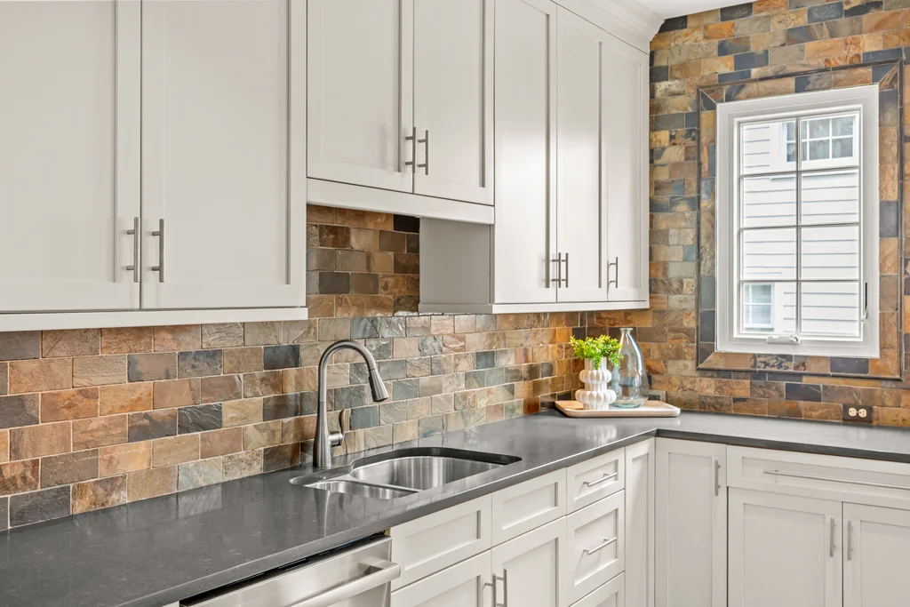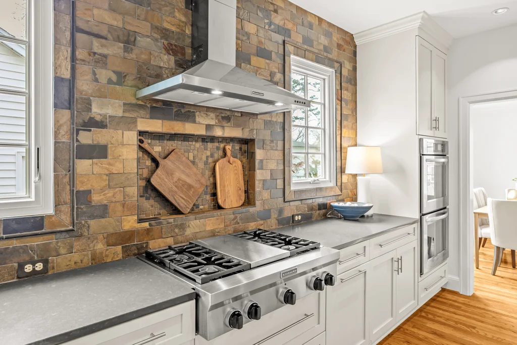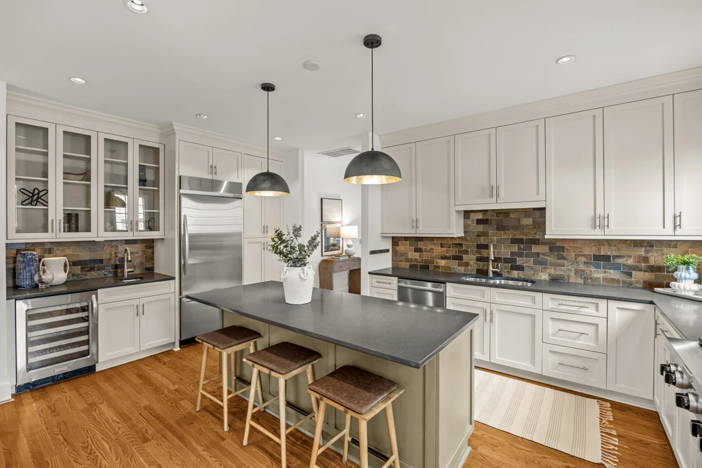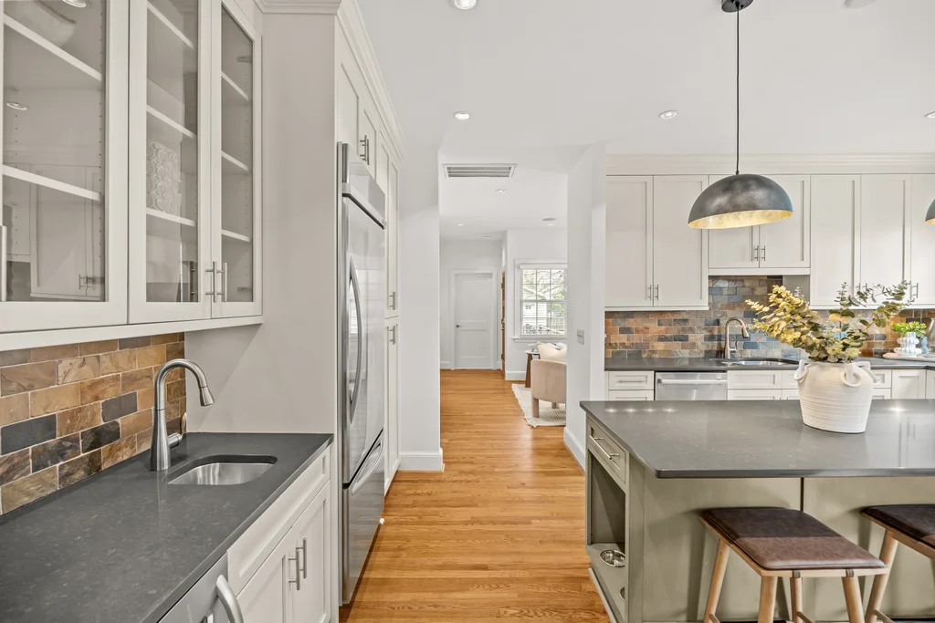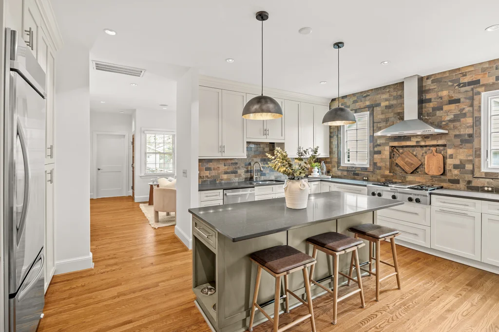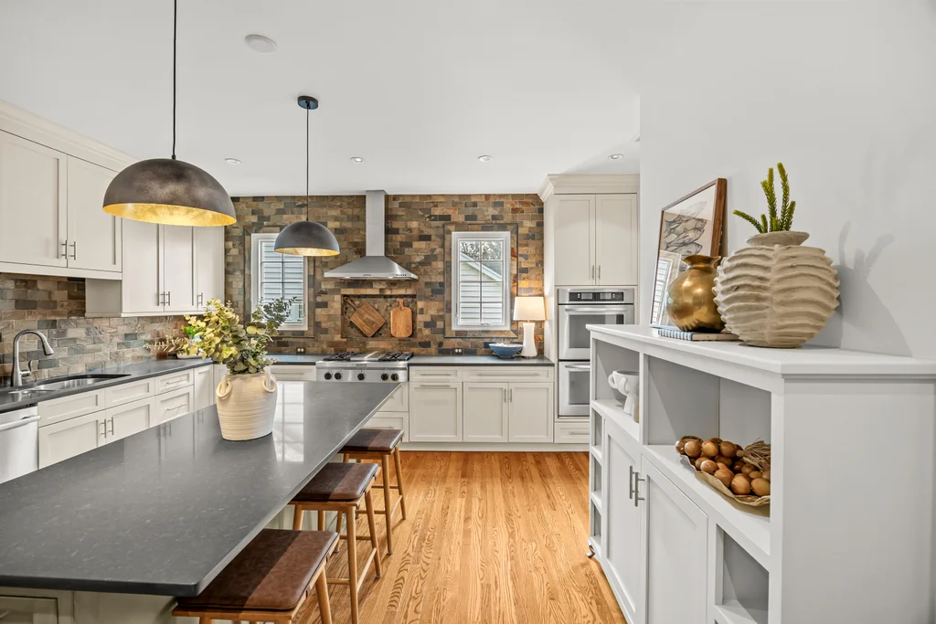 The kitchen is the heart of it all — a generous island with seating & storage, surrounded by high-end cabinetry, pantry with pull-out shelving, wet bar with beverage fridge, built-in bookcase, a dedicated dog feeding station and incredible counter space. KitchenAid professional gas cooktop, double wall ovens, stone counters, and slate backsplash complete the space. The family room flows to the rear deck and yard — a natural place to gather in or out.