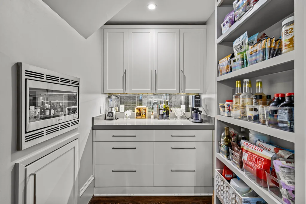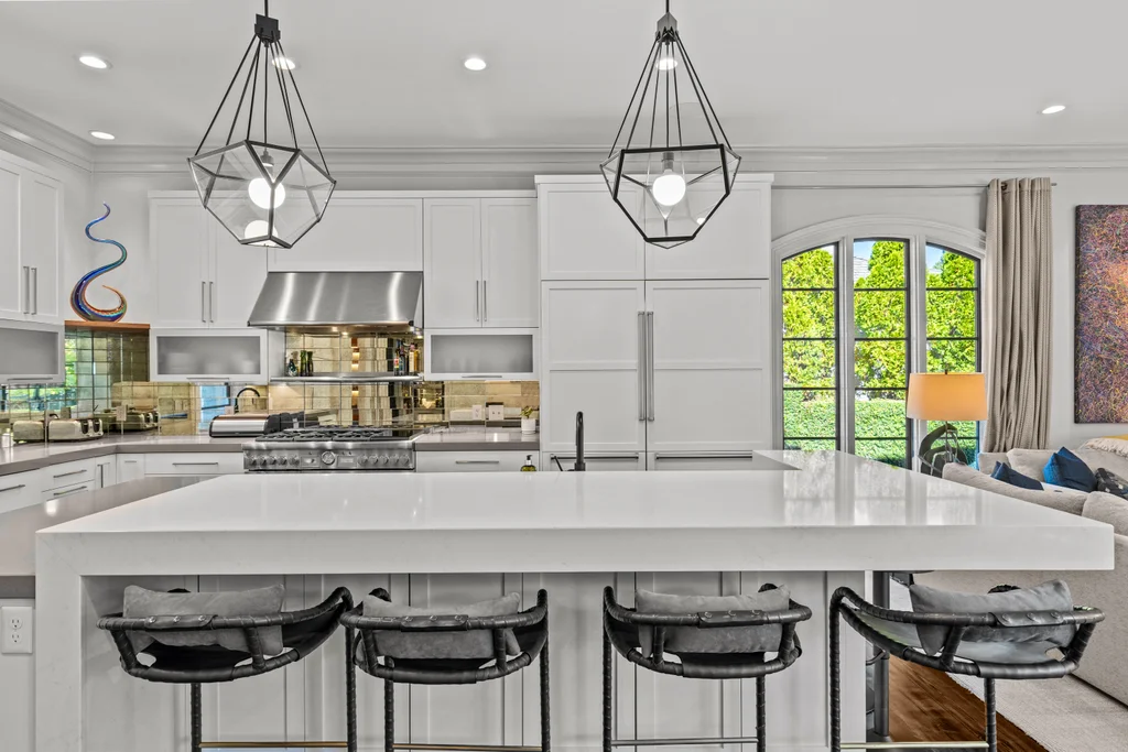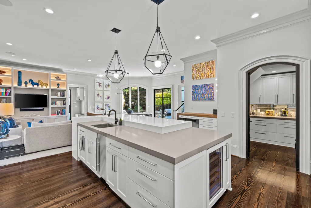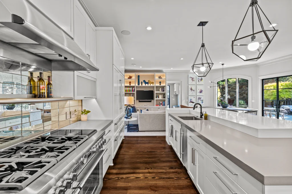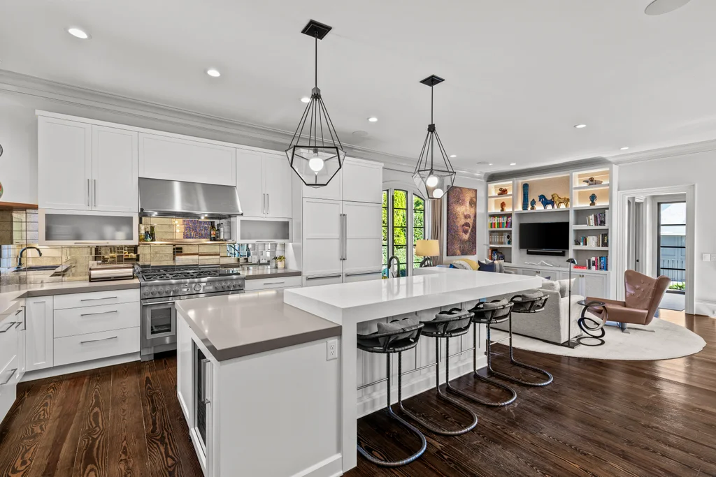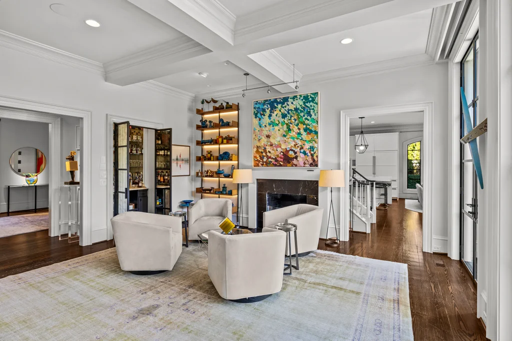 The main level flows effortlessly for everyday living or gracious entertaining. Generous dining room with modern glass chandelier & fireplace, coffered-ceiling living room with bar and gas fireplace opens to the terrace, and a study with fireplace & custom backlit shelving- beautiful rooms for all your needs. The open kitchen, morning room & dining area are perfect for busy days or relaxed weekends. The renovated kitchen features quartzite counters, custom cabinetry, island with seating for 8, Thermador professional gas range, Sub Zero refrigerator and bev. fridge. The scullery hosts an additional beverage refrigerator, and abundant cabinetry.