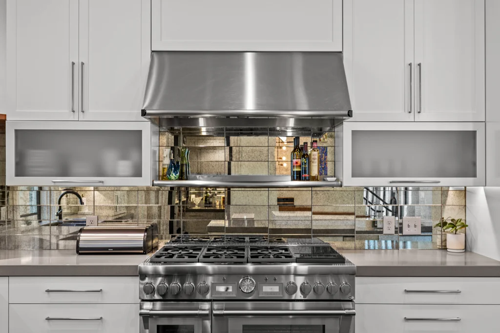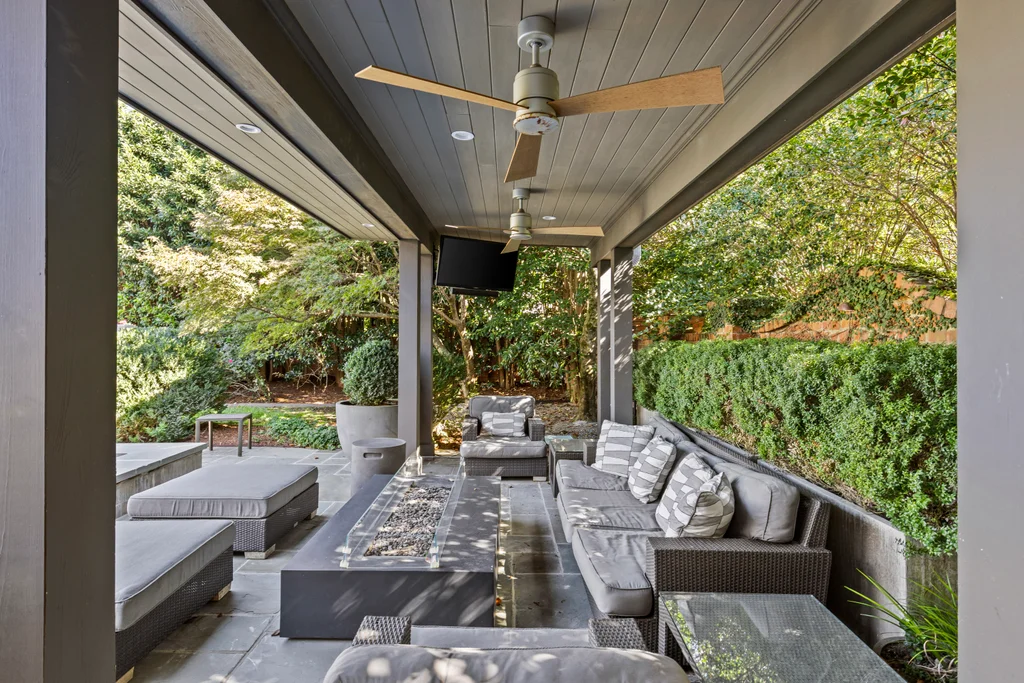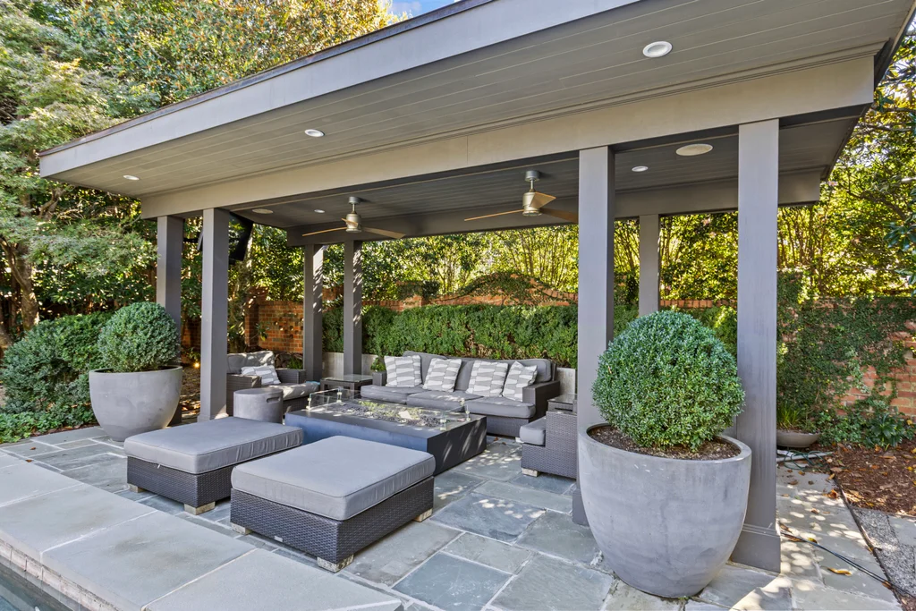 Glass and steel doors open to the beautiful outdoor living spaces- the bluestone terrace with seating around the wood burning fireplace, spacious dining area with built in grill and refrigerator. The pool and spa center on the cabana with a modern firepit and generous seating all surrounded by a fully fenced yard with mature landscaping.