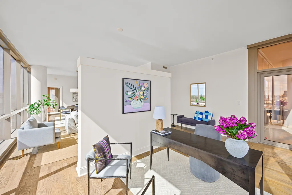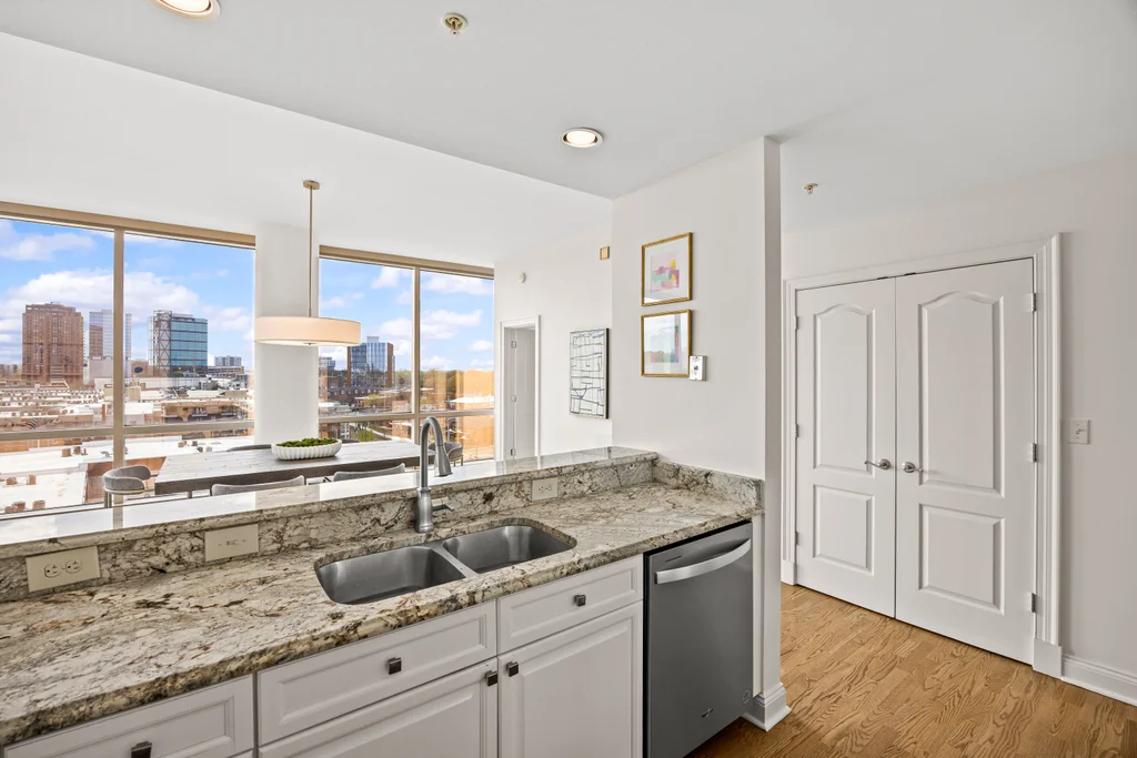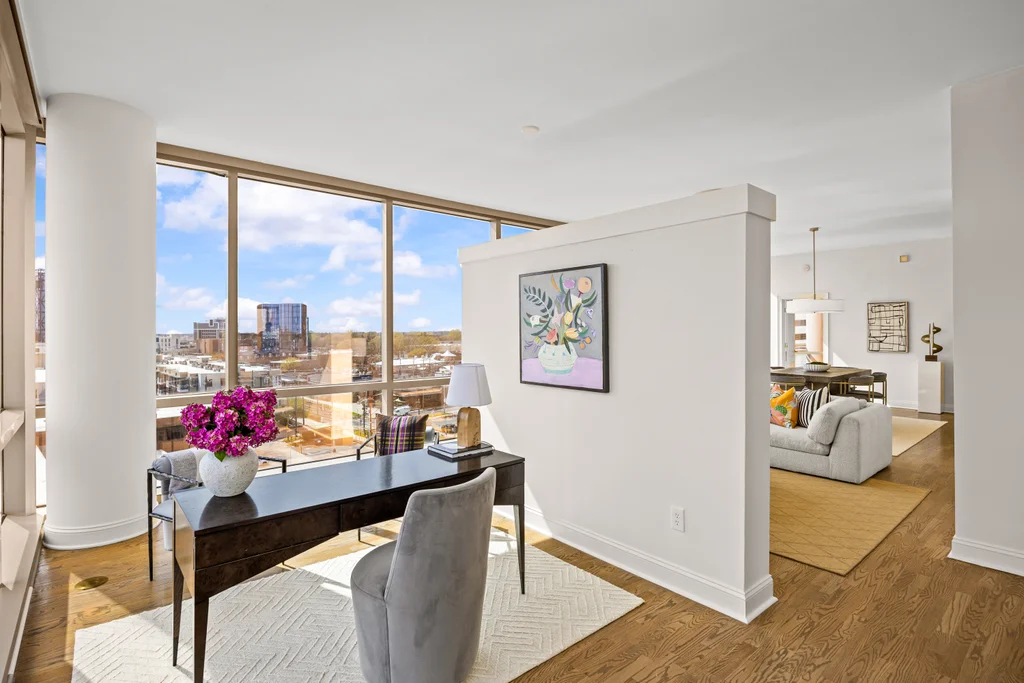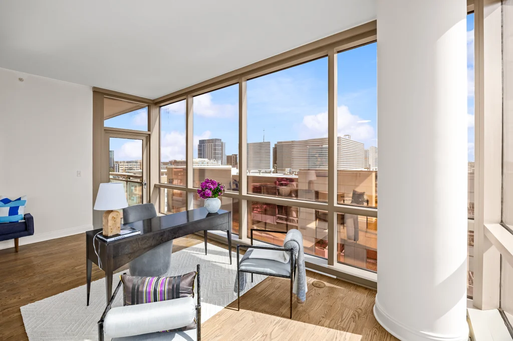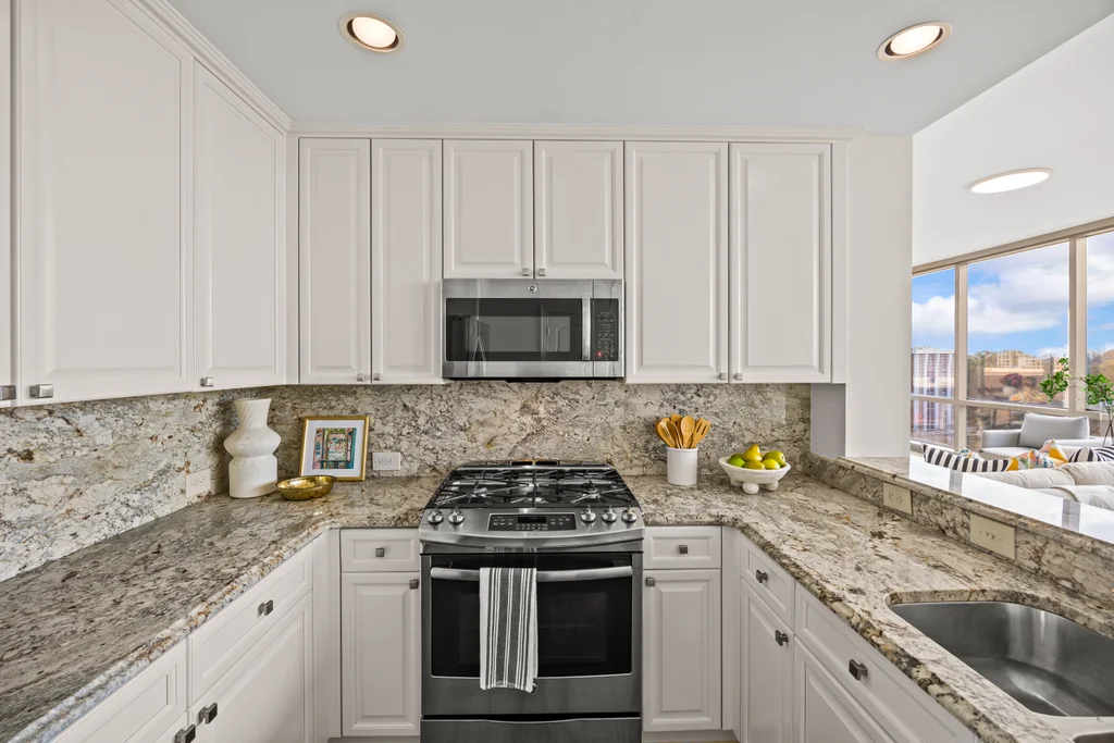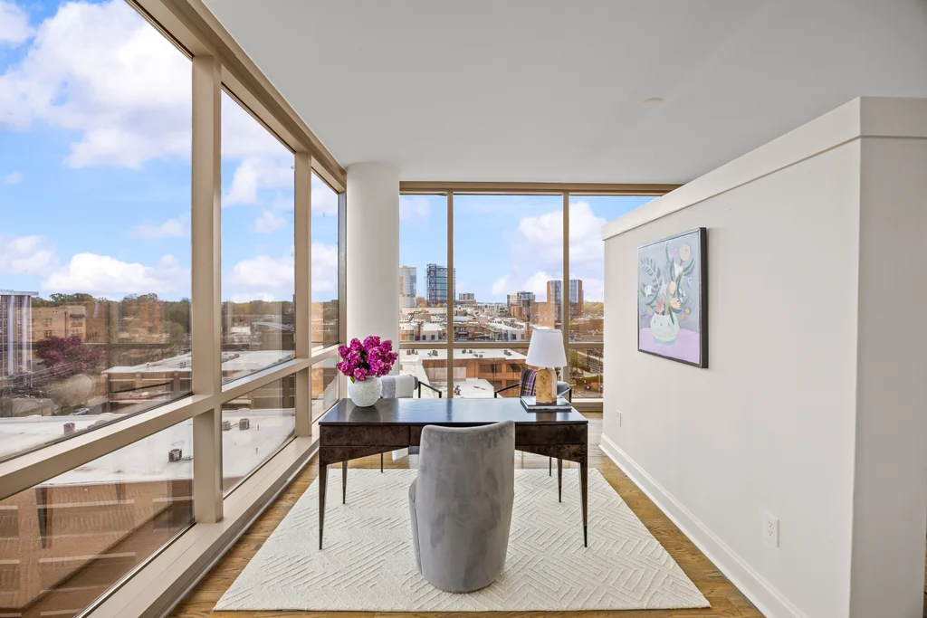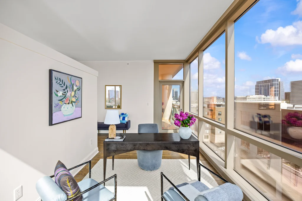 The views take center stage with expansive windows from every, angle lighting up the days and creating a serene stary scene by night. Easy living in this beautifully flexible floorplan, with spacious and open living & dining fabulous for entertaining or a cozy night on the couch in your sky high retreat. Work life balance at it's best-in the office with city and long range views and access to one of the two balconies. The split bedroom plan makes hosting guests or family a dream. The updated kitchen features white cabinets, stone counters, & newer ss appliances including a gas range.